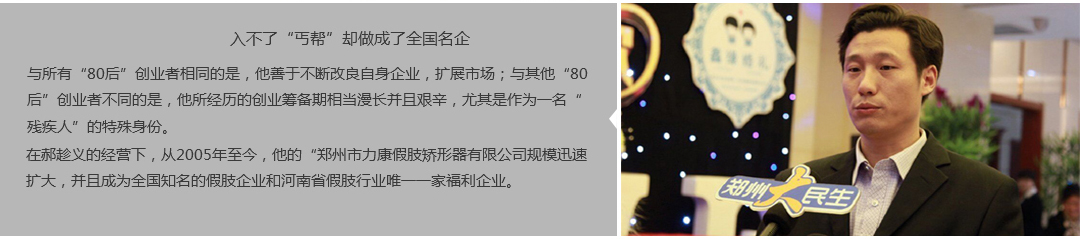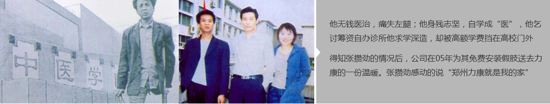 鄭州市力康假肢矯形器有限公司(簡稱力康),是一家專業(yè)從事假肢矯形器的設(shè)計(jì)、研發(fā)、制作及裝 配的專業(yè)機(jī)構(gòu)。成立于1992年是河南省唯一一家福利企業(yè)。力康下設(shè)業(yè)務(wù)部、技術(shù)部、住院部、康復(fù) 部、售后服務(wù)部,并配有現(xiàn)代化的裝配車間和功能齊全的訓(xùn)練大廳,為殘疾朋友康復(fù)訓(xùn)練提供了可靠 保障。總經(jīng)理穿戴假肢多年,有著豐富的臨床經(jīng)驗(yàn)和親身體會;多年來,力康已為全國幾十萬名殘疾 朋友安裝上舒適、美觀、耐用的假肢和矯形器具,使他們更大限度地恢復(fù)了正常的工作和生活?!爱a(chǎn) 品即人品”的質(zhì)量理念、先進(jìn)的技術(shù)、實(shí)惠的價(jià)格、完善的售后服務(wù)是力康取勝的法寶……